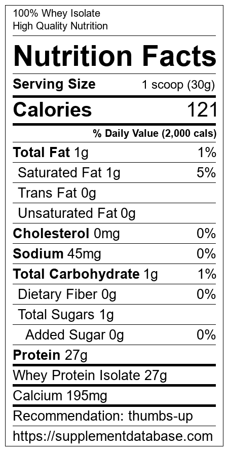 100% Whey Isolate is a protein supplement manufactured by High Quality Nutrition. It ranks 12 out of 466 protein supplements and earned an overall thumbs up recommendation based on several factors including effectiveness, research rating, ranking, protein content, and nutrition label transparency.