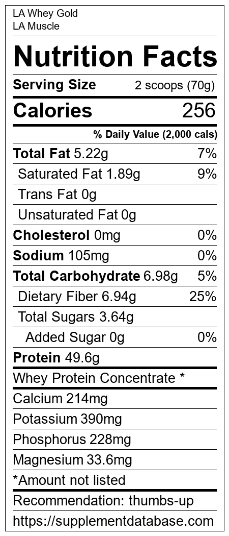 LA Whey Gold is a protein supplement manufactured by LA Muscle. It ranks 271 out of 466 protein supplements and earned an overall thumbs up recommendation based on several factors including effectiveness, research rating, ranking, protein content, and nutrition label transparency.