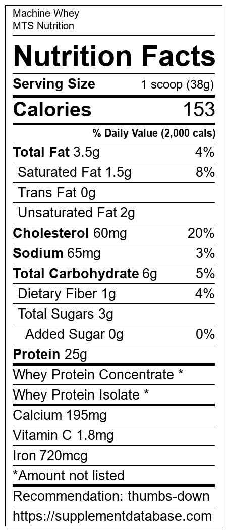 Machine Whey is a protein supplement manufactured by MTS Nutrition. It ranks 391 out of 466 protein supplements and earned an overall thumbs down recommendation based on several factors including effectiveness, research rating, ranking, protein content, and nutrition label transparency.