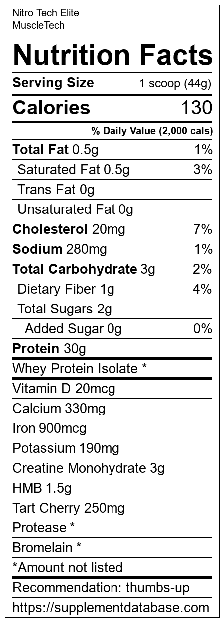 Nitro Tech Elite is a protein supplement manufactured by MuscleTech. It ranks 81 out of 466 protein supplements and earned an overall thumbs up recommendation based on several factors including effectiveness, research rating, ranking, protein content, and nutrition label transparency.