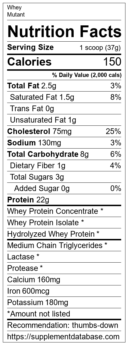 Whey is a protein supplement manufactured by Mutant. It ranks 385 out of 466 protein supplements and earned an overall thumbs down recommendation based on several factors including effectiveness, research rating, ranking, protein content, and nutrition label transparency.
