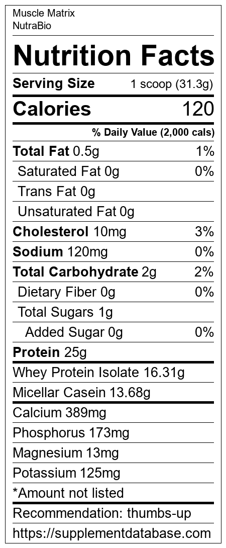 Muscle Matrix is a protein supplement manufactured by NutraBio. It ranks 23 out of 466 protein supplements and earned an overall thumbs up recommendation based on several factors including effectiveness, research rating, ranking, protein content, and nutrition label transparency.