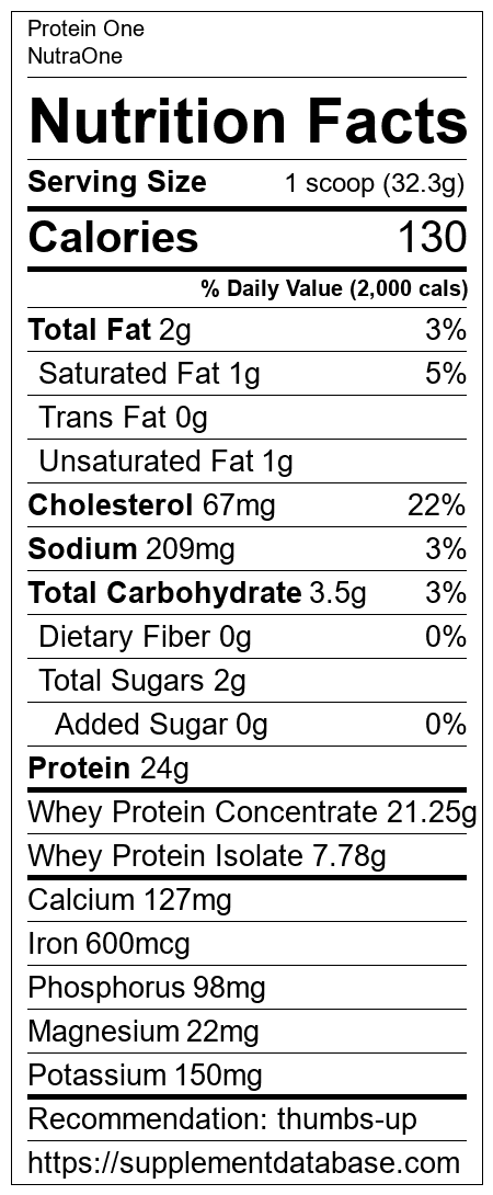 Protein One is a protein supplement manufactured by NutraOne. It ranks 7 out of 466 protein supplements and earned an overall thumbs up recommendation based on several factors including effectiveness, research rating, ranking, protein content, and nutrition label transparency.