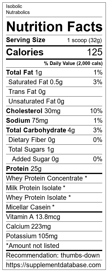 Isobolic is a protein supplement manufactured by Nutrabolics. It ranks 374 out of 466 protein supplements and earned an overall thumbs down recommendation based on several factors including effectiveness, research rating, ranking, protein content, and nutrition label transparency.