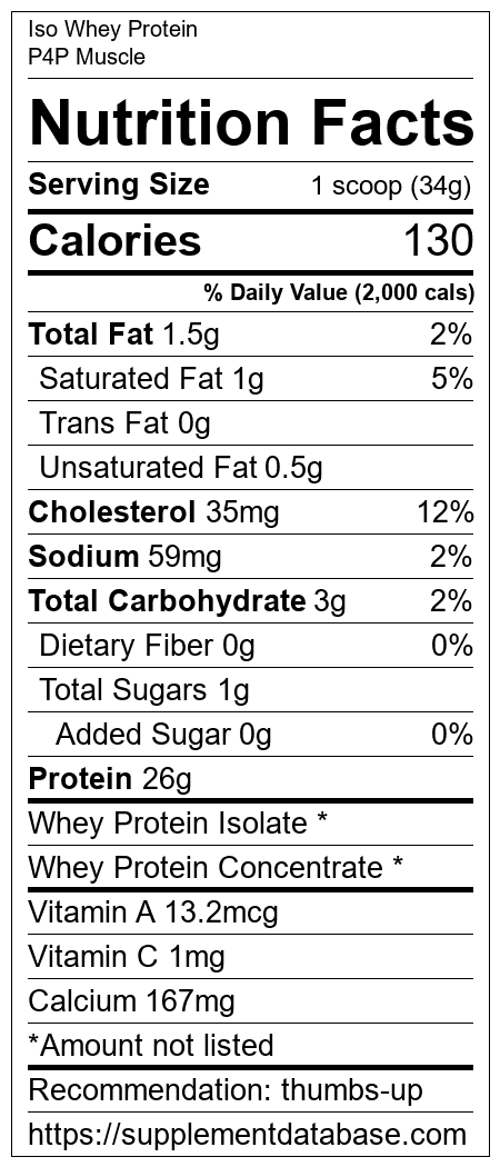 Iso Whey Protein is a protein supplement manufactured by P4P Muscle. It ranks 118 out of 466 protein supplements and earned an overall thumbs up recommendation based on several factors including effectiveness, research rating, ranking, protein content, and nutrition label transparency.