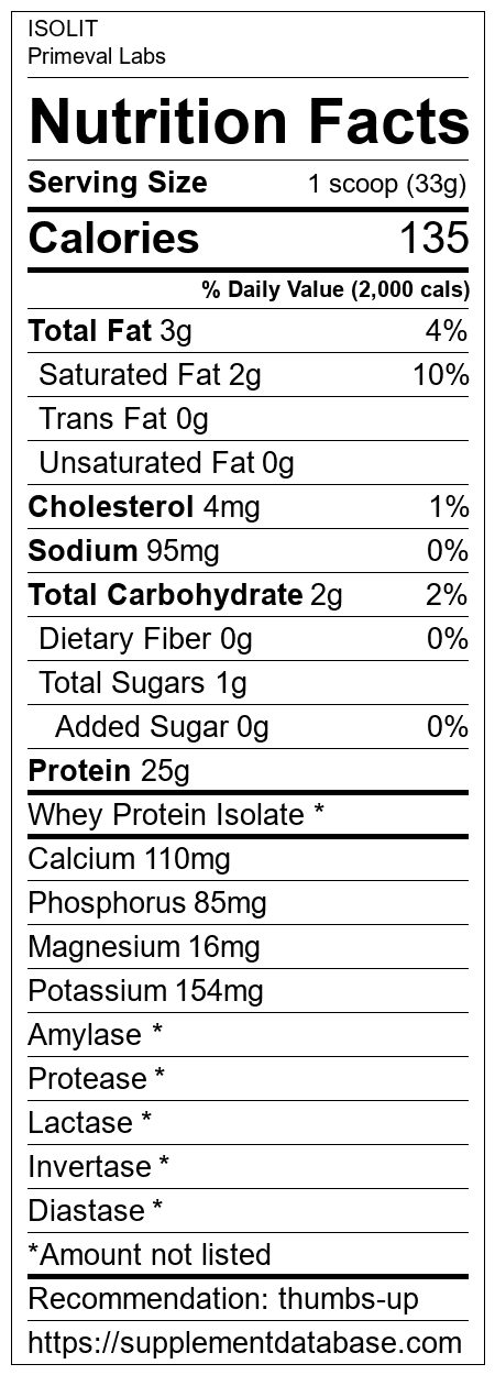 ISOLIT is a protein supplement manufactured by Primeval Labs. It ranks 273 out of 466 protein supplements and earned an overall thumbs up recommendation based on several factors including effectiveness, research rating, ranking, protein content, and nutrition label transparency.