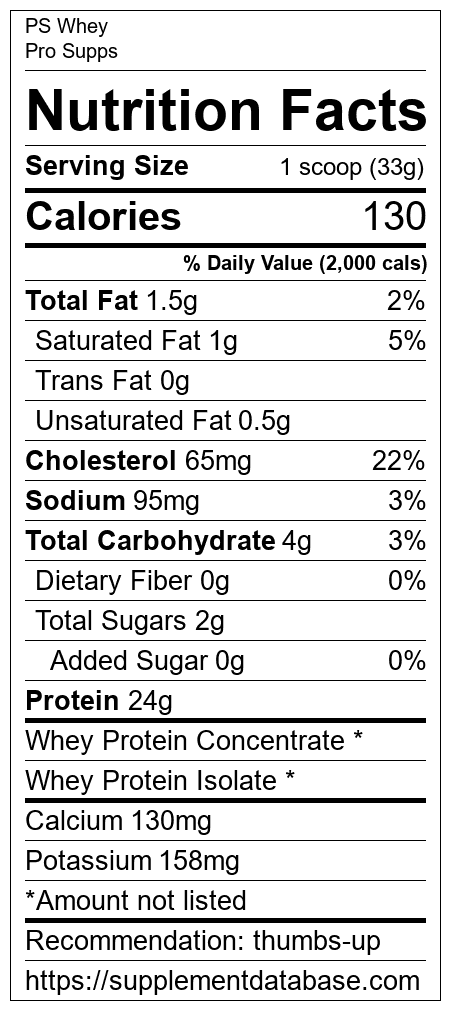 PS Whey is a protein supplement manufactured by Pro Supps. It ranks 70 out of 466 protein supplements and earned an overall thumbs up recommendation based on several factors including effectiveness, research rating, ranking, protein content, and nutrition label transparency.