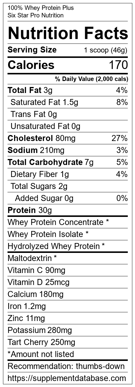 100% Whey Protein Plus is a protein supplement manufactured by Six Star Pro Nutrition. It ranks 456 out of 466 protein supplements and earned an overall thumbs down recommendation based on several factors including effectiveness, research rating, ranking, protein content, and nutrition label transparency.