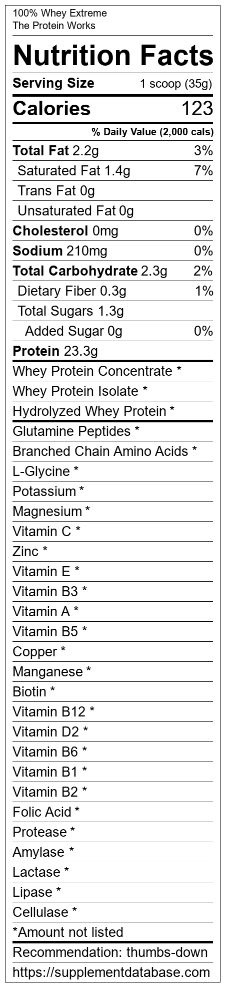 100% Whey Extreme is a protein supplement manufactured by The Protein Works. It ranks 400 out of 466 protein supplements and earned an overall thumbs down recommendation based on several factors including effectiveness, research rating, ranking, protein content, and nutrition label transparency.