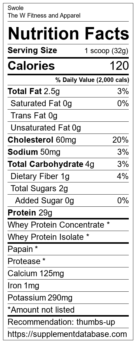 Swole is a protein supplement manufactured by The W Fitness and Apparel. It ranks 319 out of 466 protein supplements and earned an overall thumbs up recommendation based on several factors including effectiveness, research rating, ranking, protein content, and nutrition label transparency.