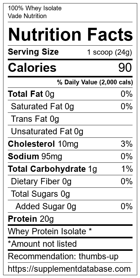 100% Whey Isolate is a protein supplement manufactured by Vade Nutrition. It ranks 170 out of 466 protein supplements and earned an overall thumbs up recommendation based on several factors including effectiveness, research rating, ranking, protein content, and nutrition label transparency.