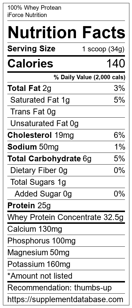 100% Whey Protean is a protein supplement manufactured by iForce Nutrition. It ranks 302 out of 466 protein supplements and earned an overall thumbs up recommendation based on several factors including effectiveness, research rating, ranking, protein content, and nutrition label transparency.